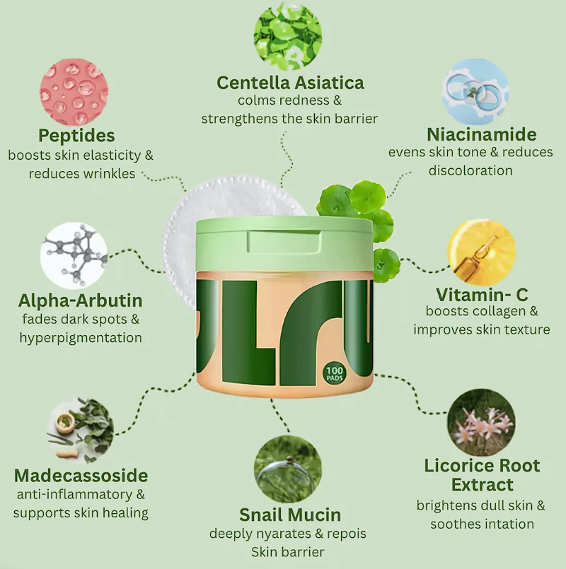 Fine lines, breakouts? Gone. These toner pads help firm and smooth your skin with every use. Peptides and Centella Asiatica work together to boost elasticity. Your skin feels tighter, looks lifted, and glows with a youthful bounce.